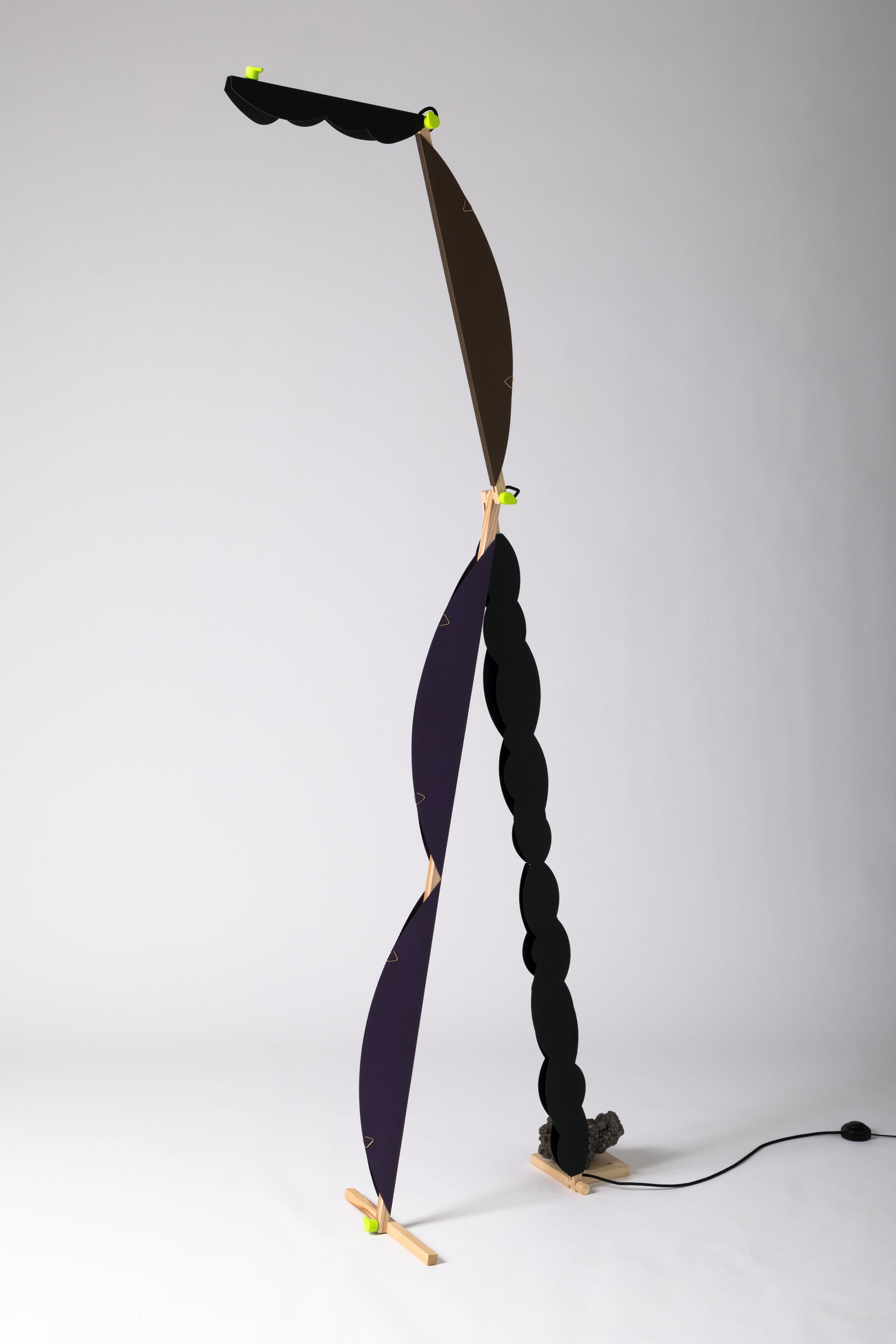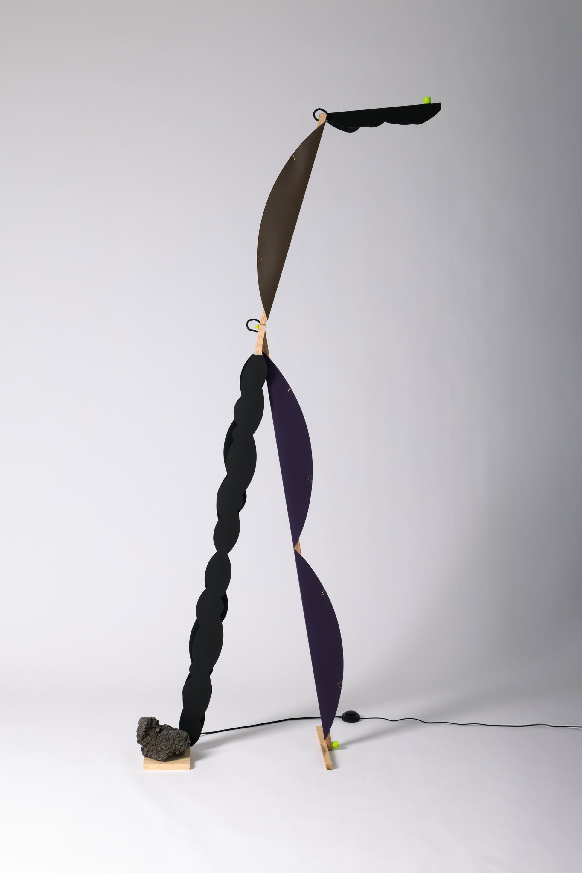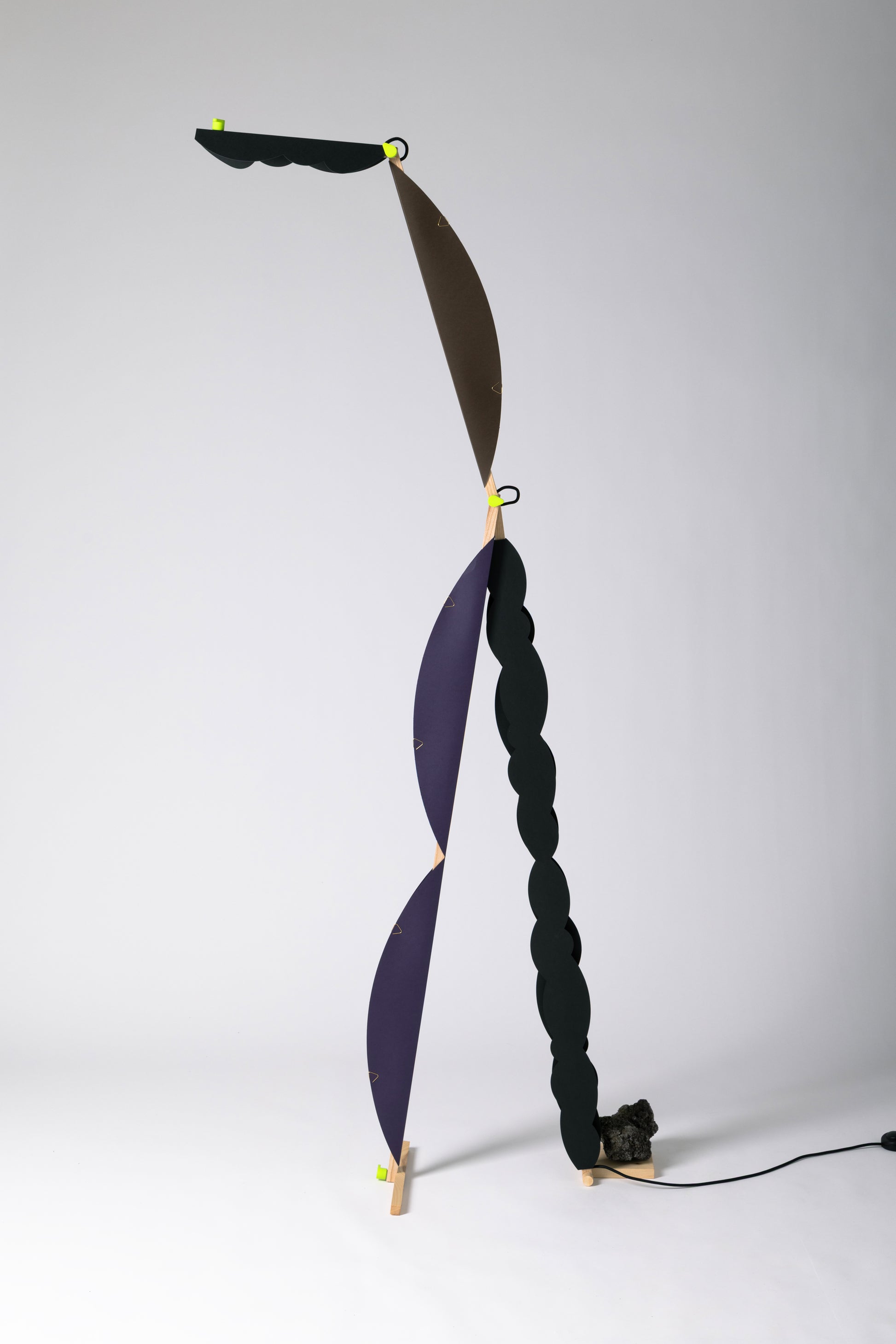 This version features a carefully balanced arrangement of forms. Two brown and one purple HALFMOON add-on are combined with two black BLIP add-ons and a matching BLIP shade. The design includes four 3D-printed knobs, a wooden knob, and a black textile cable.