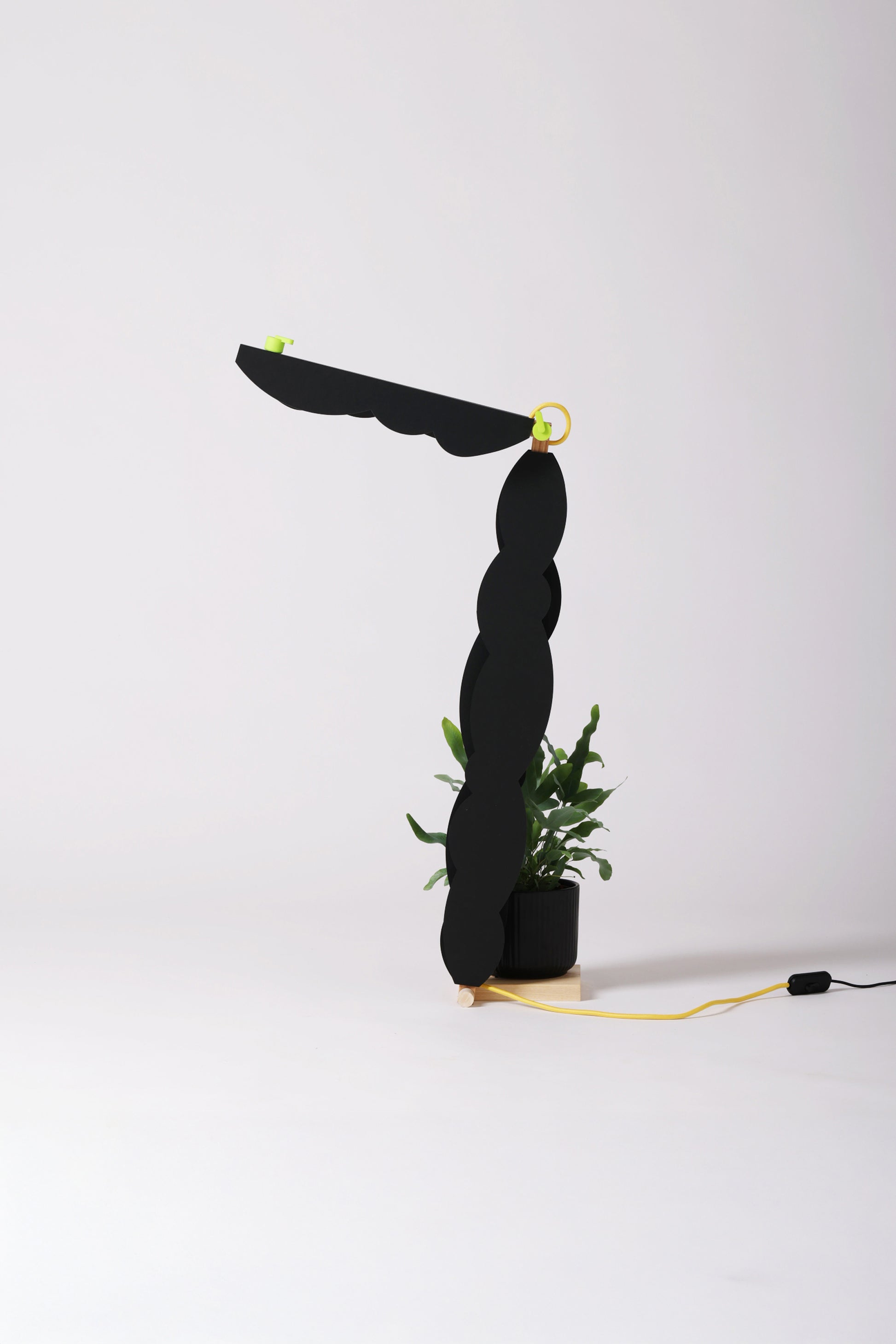 This version features the organic curves of the black cardboard BLIP shade, highlighted by vivid green knobs and a yellow textile cable.