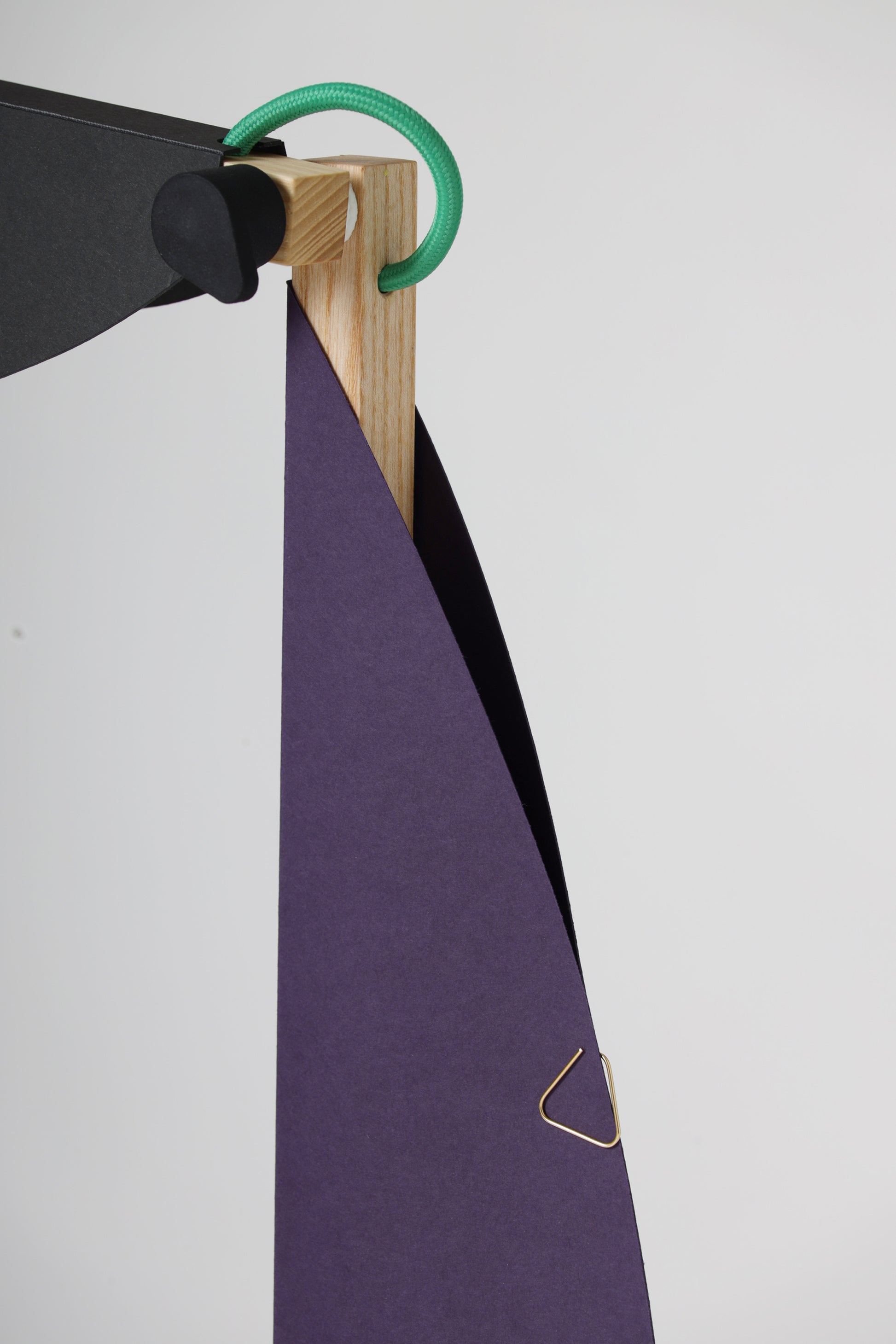 This version combines the geometric HALFMOON paper add-on with the curved lines of the black cardboard BLIP shade, fastened using a ZENITH corner clip. Includes two 3D-printed knobs, a wooden knob, and a green textile cable.