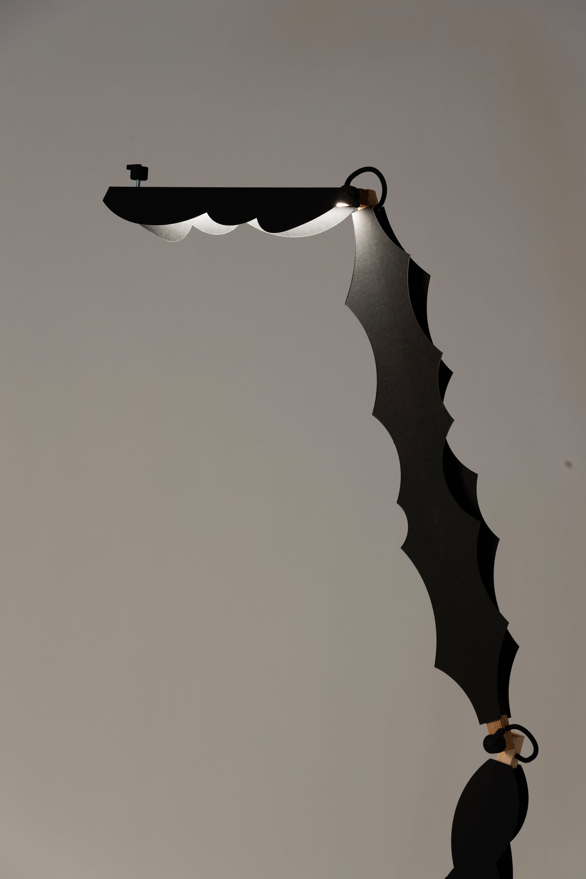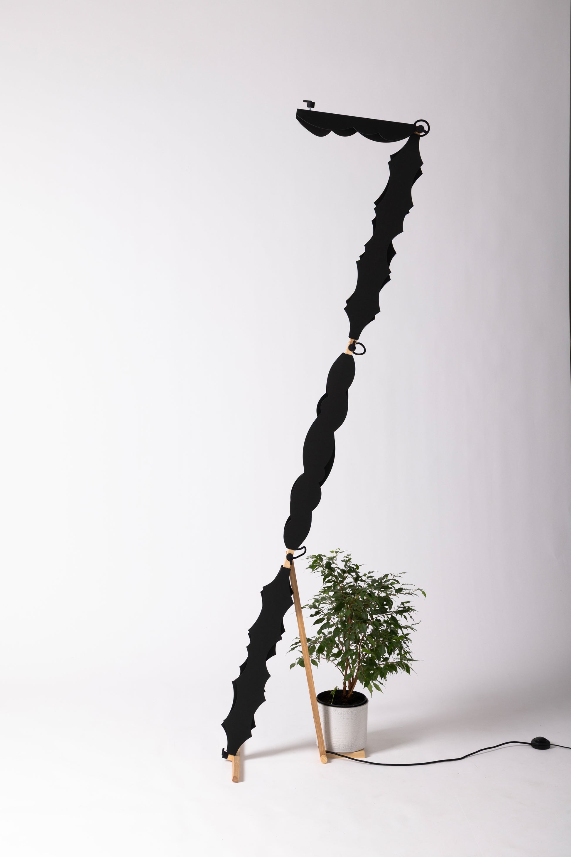 This version of the lamp features a bold combination of forms. Black DIP and BLIP add-ons are positioned one after another, forming a distinctive line ending with a BLIP shade. The design includes four black knobs 3D-printed with recycled filament, a wooden knob, and a black textile cable.