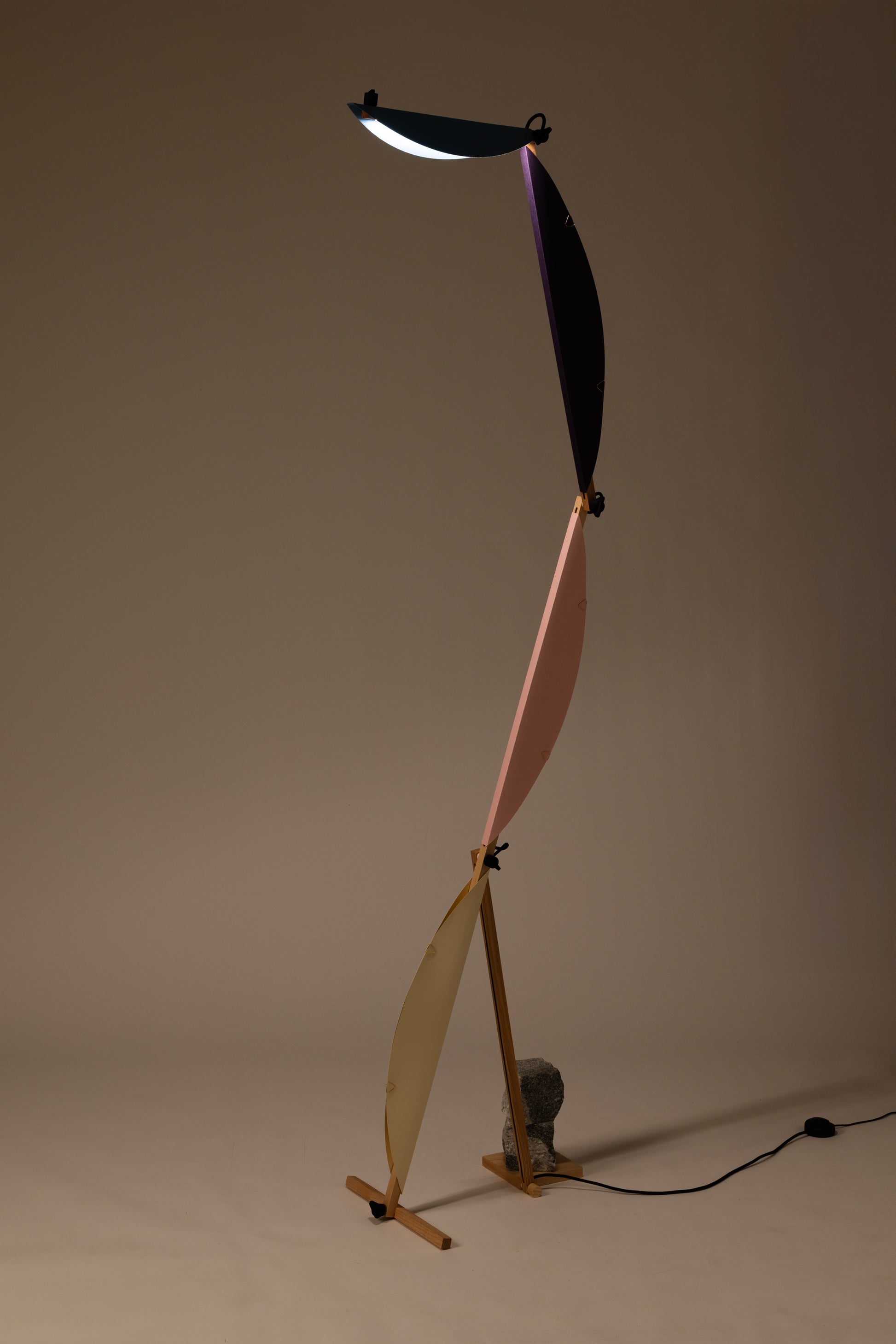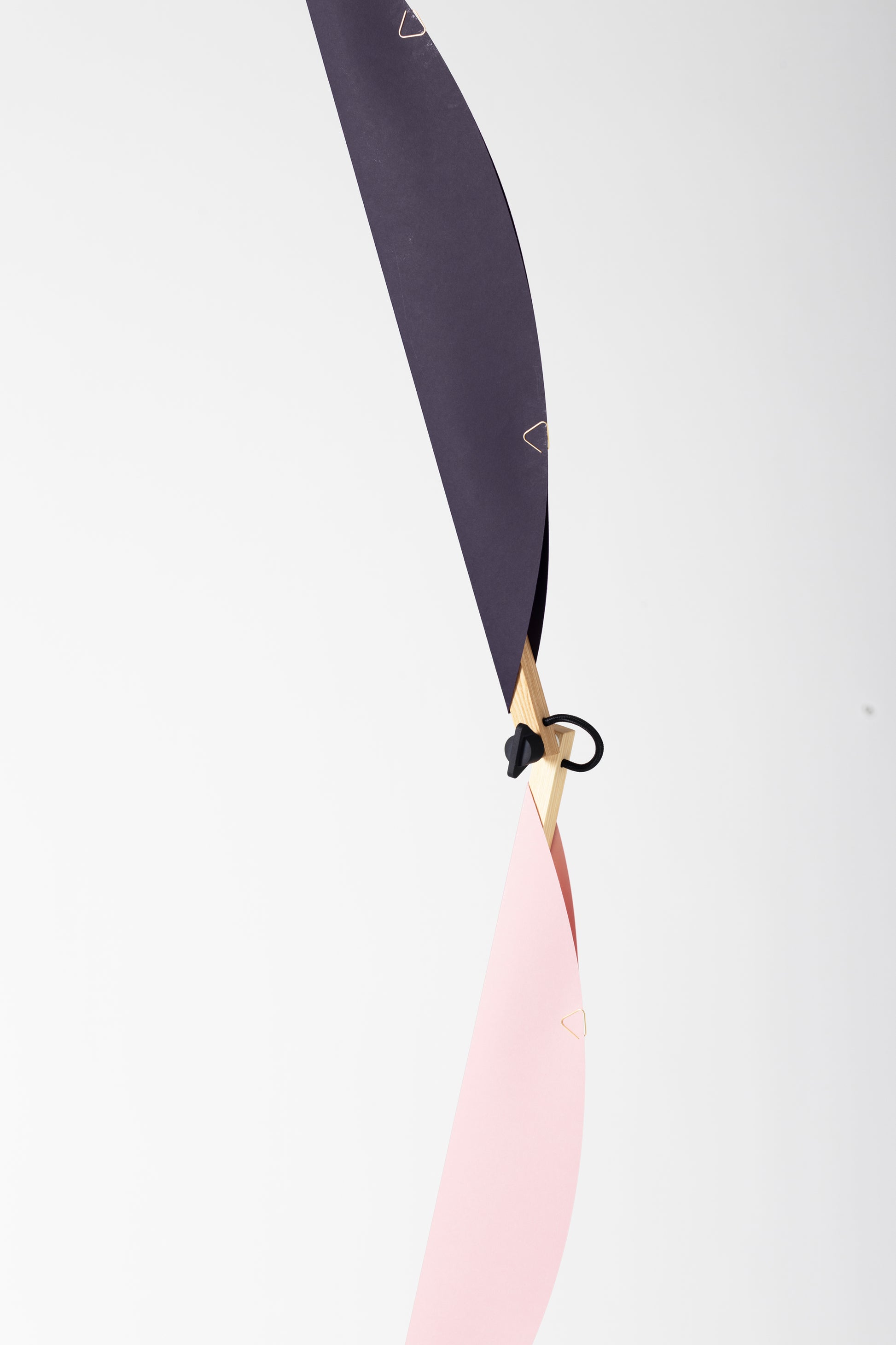This version of the lamp features a colorful combination of HALFMOON add-ons. Crafted from GF Smith’s Colorplan paper, secured with a classic ZENITH corner paper clip, they come in blue, purple, pink, and yellow. The design includes four black knobs 3D-printed with recycled plastic filament, a wooden knob, and a black textile cable.
