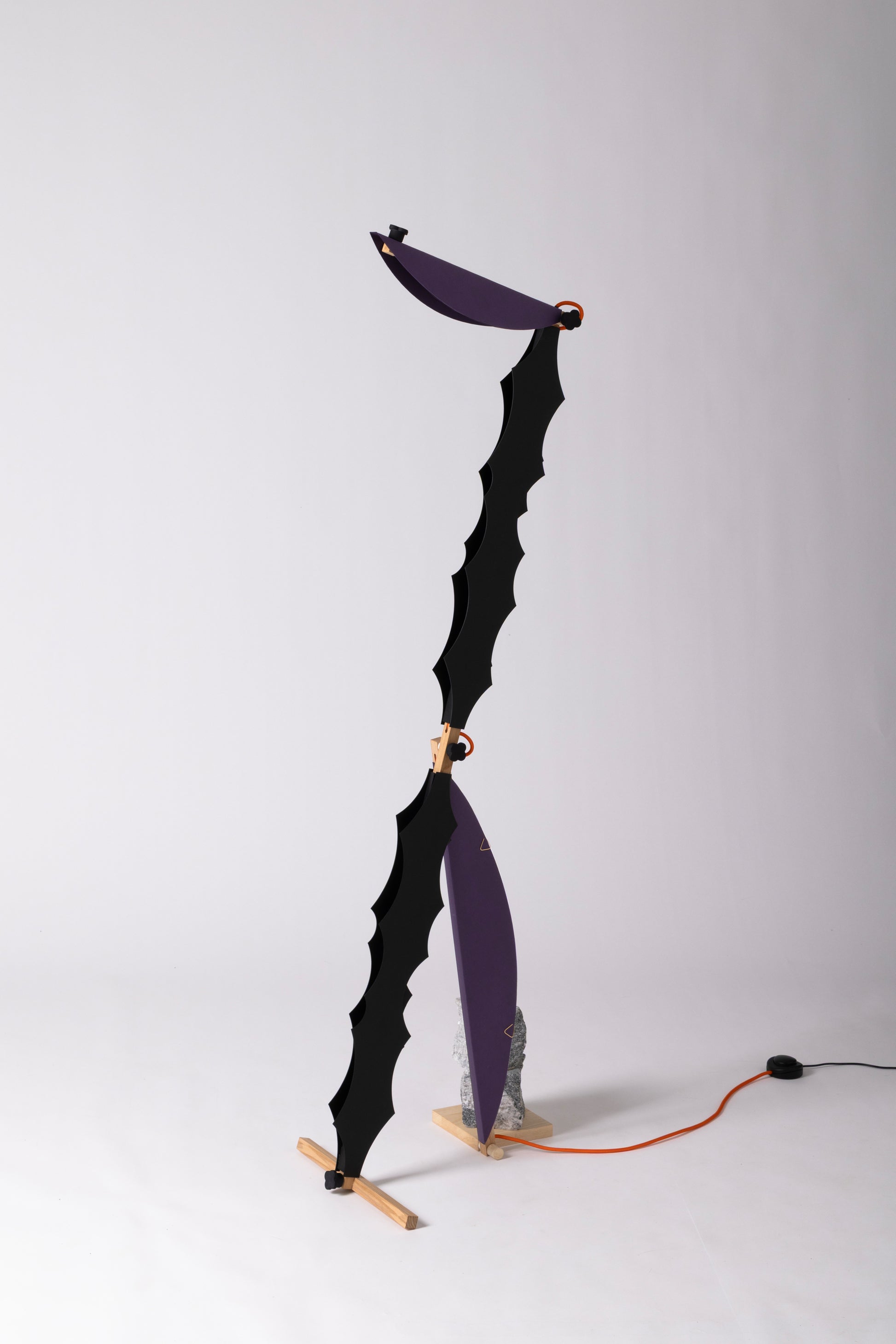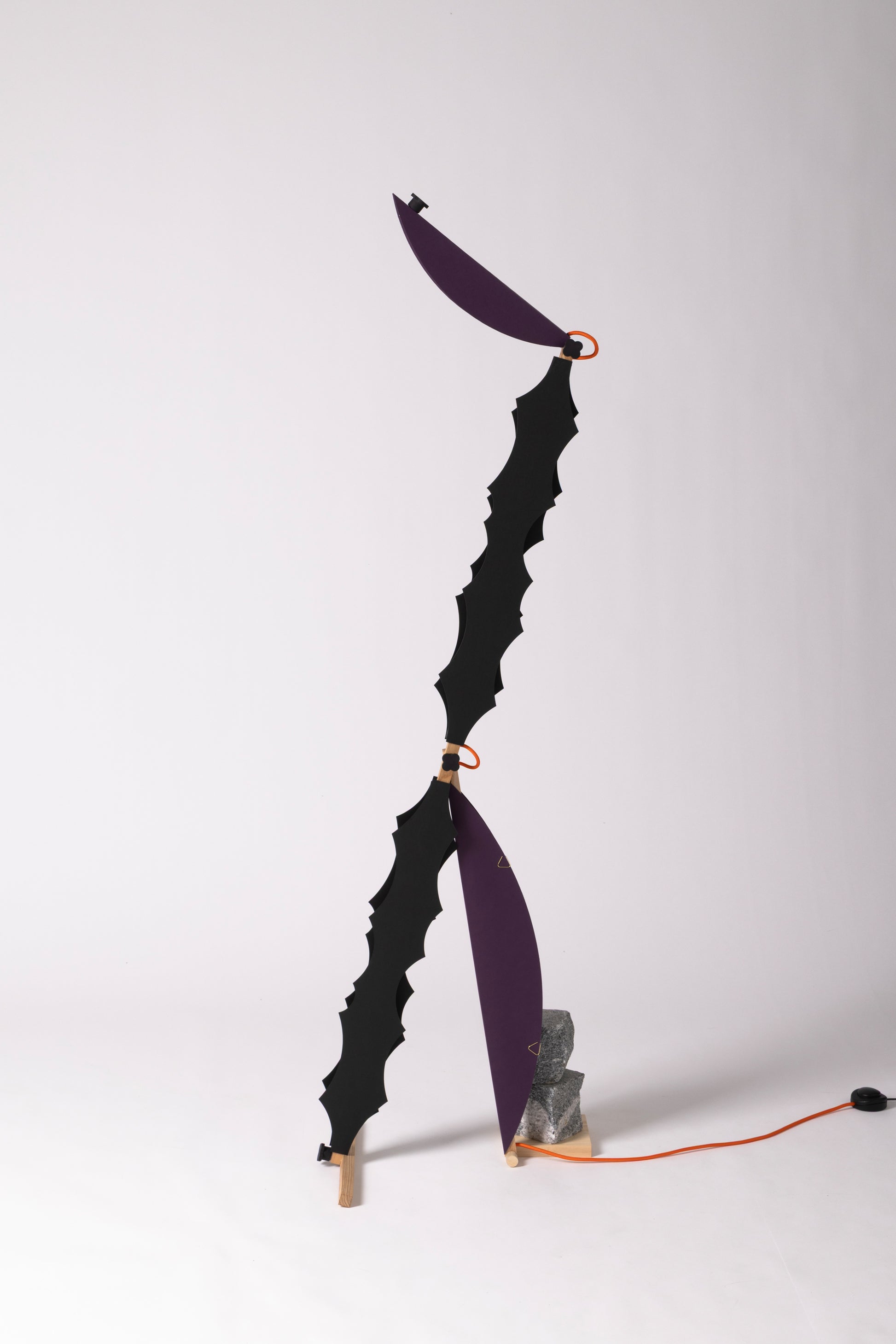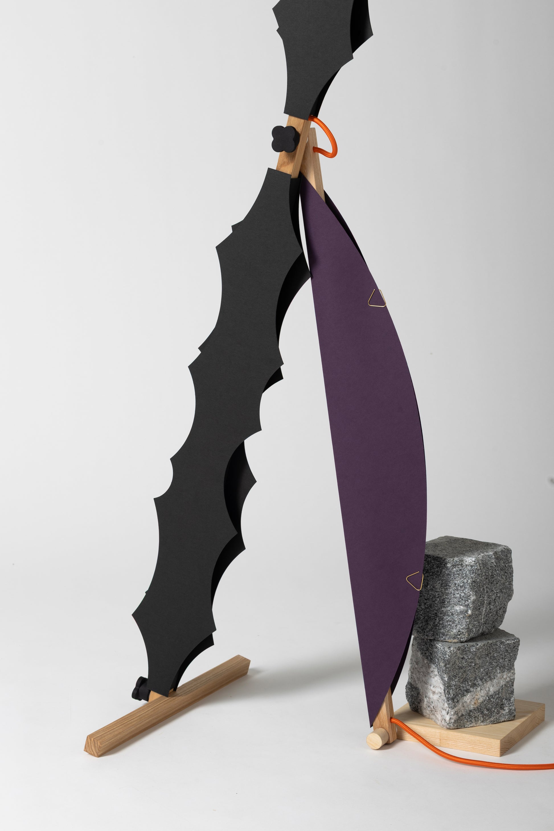 This version presents a bold composition of forms. A round, purple HALFMOON add-on and matching shade are paired with two spiky black DIP add-ons. The design includes four black knobs 3D-printed from recycled filament, a wooden knob, and an orange textile cable.