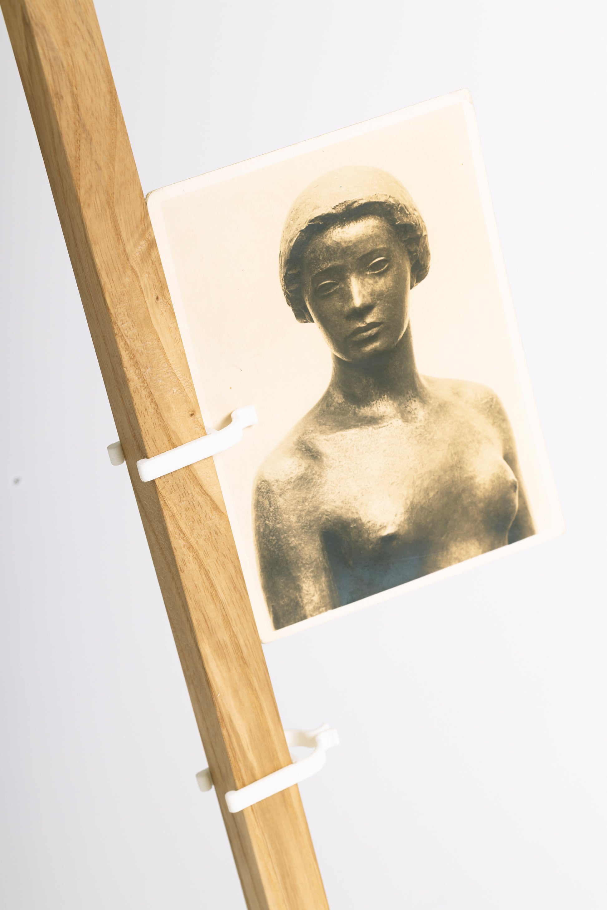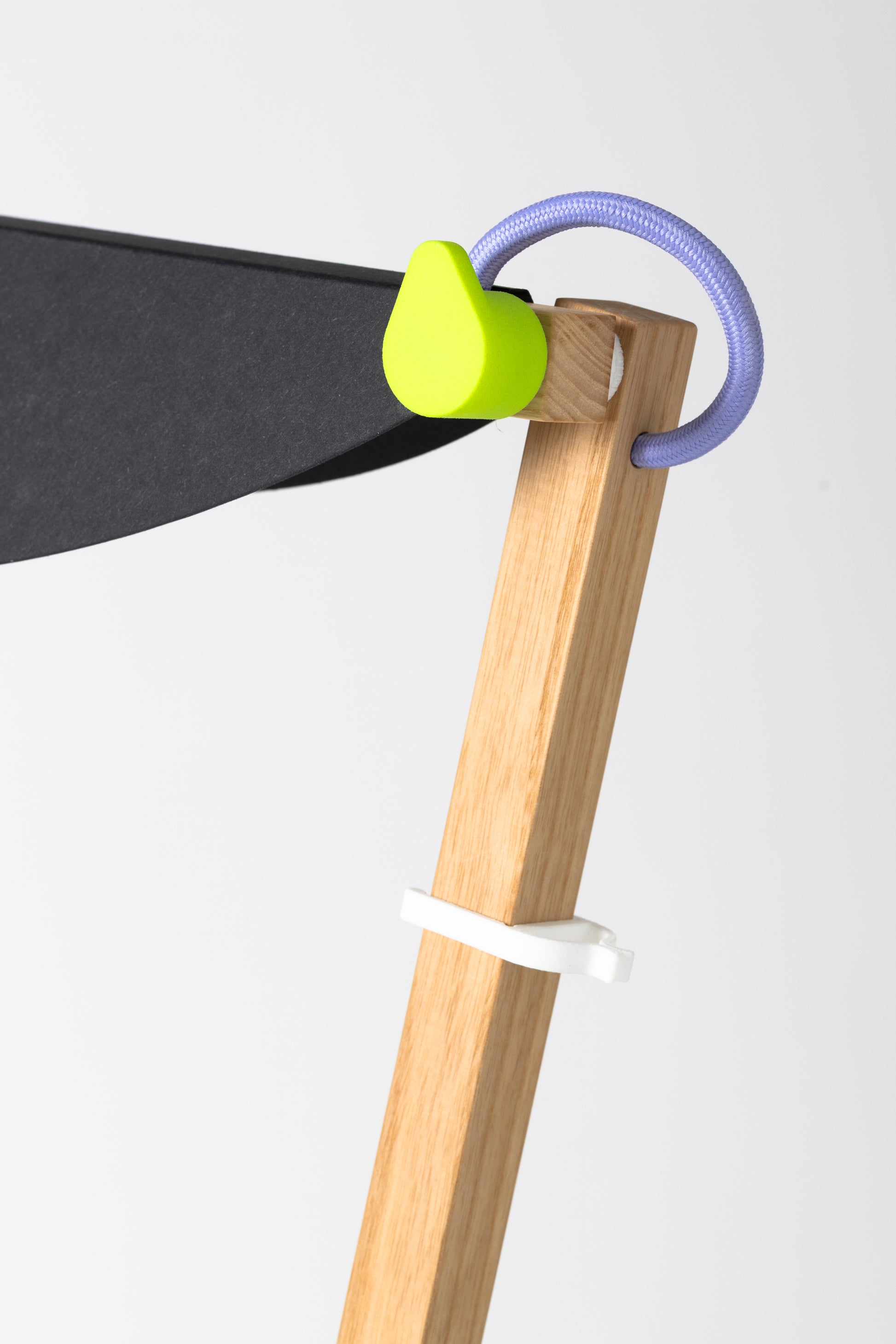 This lamp offers a platform for personal expression, turning it into a display of your own memories. It includes six CLIP attachments for showcasing photographs, notes, or postcards. The design features four green knobs 3D-printed from recycled filament, a wooden knob, and a distinctive violet textile cable.